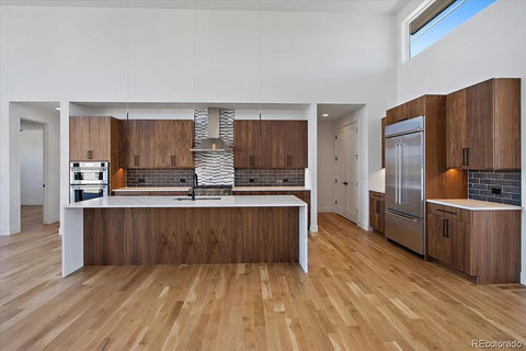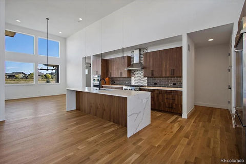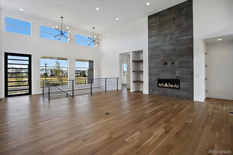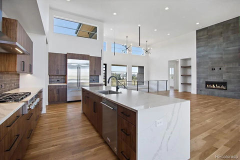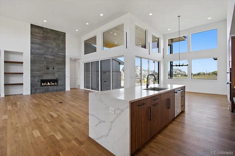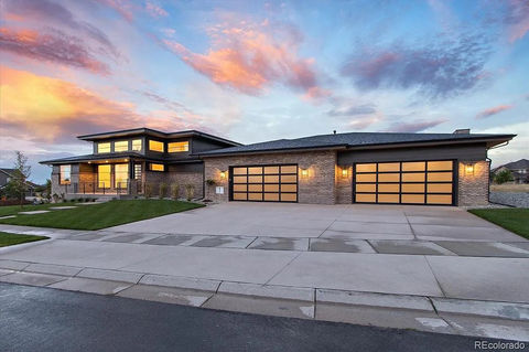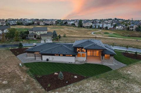 This ranch home features vaulted ceilings, 6 total bedrooms, 4 baths and 5,421 finished square feet. A beautiful floating staircase to the basement with fireplace, bar, large entertainment area, 3 bedrooms, storage room and large light filled windows. There is a 2,100 square foot garage which includes its own furnace, 220V outlet, room for car lifts and plenty of space to enjoy and entertain. The kitchen features a center island, quartz countertops, waterfall style island, tile backsplash, large pantry and stainless appliances including a gas cooktop. The main level has hardwood throughout, fireplace, vaulted ceiling in the main area, expansive walls of windows, and two sliding glass doors to the covered back patio to allow for indoor outdoor living. The spacious laundry room includes plenty of storage, room for an additional fridge, butler’s pantry, and access to the master bedroom. The master features a walk-in closet, 5-piece master bathroom with free standing tub. The main floor also includes 2 additional bedrooms sharing a Jack n Jill bathroom. Enjoy wonderful Colorado outdoor living on the fully landscaped .41 acres with a professionally landscaped yard on the front porch with views of the golf course or the large beautiful covered back patio.